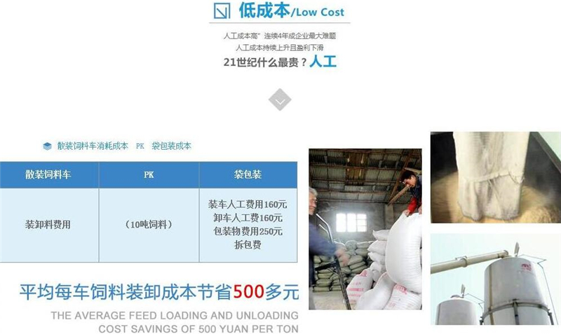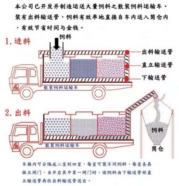 散裝飼料車的優(yōu)勢: 散裝飼料的生產(chǎn)可實現(xiàn)直接生產(chǎn)直接裝車,隨產(chǎn)隨出,不需要進行提前備貨,不占用倉儲設(shè)施,也不會出現(xiàn)停產(chǎn)等待拉料的現(xiàn)象,使飼料生產(chǎn)實現(xiàn)計劃管理,生產(chǎn)效率得到提升。 ★獨有倒梯形設(shè)計,散裝飼料在罐體內(nèi)密封輸送,V字形罐體卸料順暢,減少飼料的耗損,保證質(zhì)量,避免污染。 ★運輸比包裝成袋運輸不但節(jié)省勞動力,而且成本較低。 ★可選電動卸料、全液壓卸料、氣卸為全自動上料卸料,可連續(xù)作業(yè),大大提高生產(chǎn)效率。 ★罐體內(nèi)可加裝分倉,可同時運輸多種不同類的飼料或膨人介質(zhì)。部件標準化,容易維修保養(yǎng)。 頂部進料倉