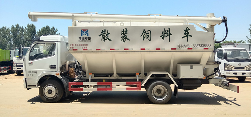 散裝飼料運(yùn)輸車(chē),散裝飼料車(chē)的飼料罐架設(shè)在卡車(chē)的底盤(pán)上,罐頂開(kāi)有進(jìn)料口.頂部的一根螺旋輸送卸料管(俗稱(chēng)卸料絞龍)則可自由回轉(zhuǎn)和抬升,抬升的仰角可達(dá)60度。運(yùn)輸時(shí),頂部的螺旋管平臥在罐頂;卸料時(shí)則抬起,使管端的出料口與畜禽飼養(yǎng)場(chǎng)貯料罐頂部的進(jìn)料門(mén)相接,駕駛室內(nèi)裝有操縱裝置(操縱裝置也可裝置在罐體尾部),卸料時(shí)通過(guò)車(chē)底的動(dòng)力輸出軸和減速器來(lái)驅(qū)動(dòng)螺旋,以完成卸料。