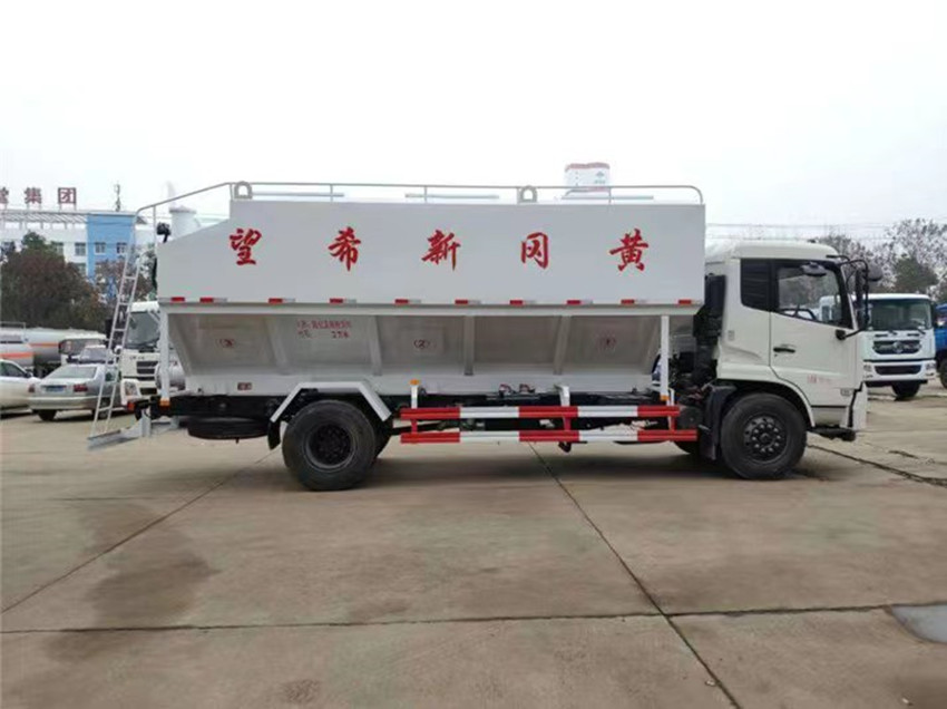 散裝飼料運(yùn)輸車,散裝飼料車的飼料罐架設(shè)在卡車的底盤上,罐頂開有進(jìn)料口.頂部的一根螺旋輸送卸料管(俗稱卸料絞龍)則可自由回轉(zhuǎn)和抬升,抬升的仰角可達(dá)60度。運(yùn)輸時(shí),頂部的螺旋管平臥在罐頂;卸料時(shí)則抬起,使管端的出料口與畜禽飼養(yǎng)場貯料罐頂部的進(jìn)料門相接,駕駛室內(nèi)裝有操縱裝置(操縱裝置也可裝置在罐體尾部),卸料時(shí)通過車底的動(dòng)力輸出軸和減速器來驅(qū)動(dòng)螺旋,以完成卸料。